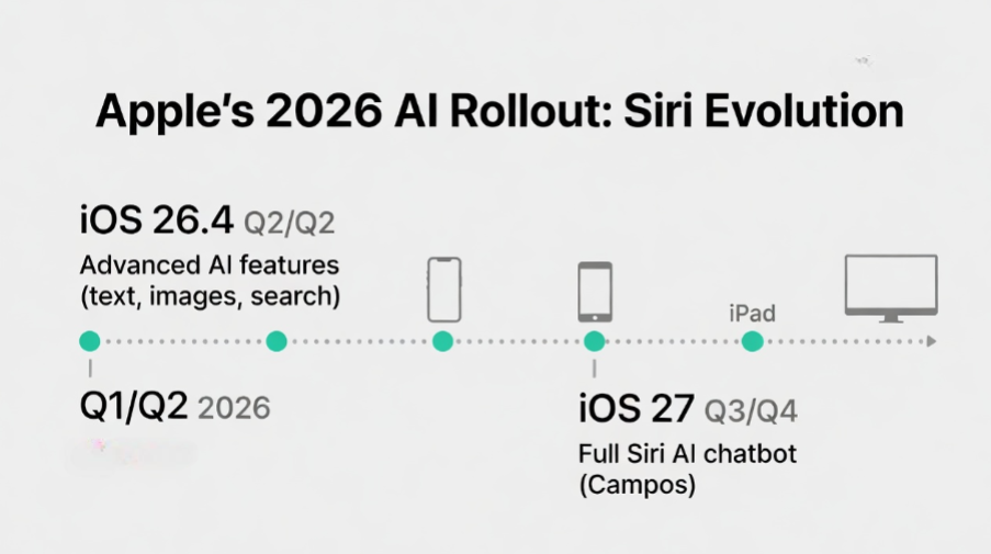 • iOS 26.4 (Spring 2026): An earlier update expected this spring will bring advanced AI features, but not the full chatbot version of Siri. This will likely focus on smarter search, writing suggestions, image effects, and some basic AI assisted tools.