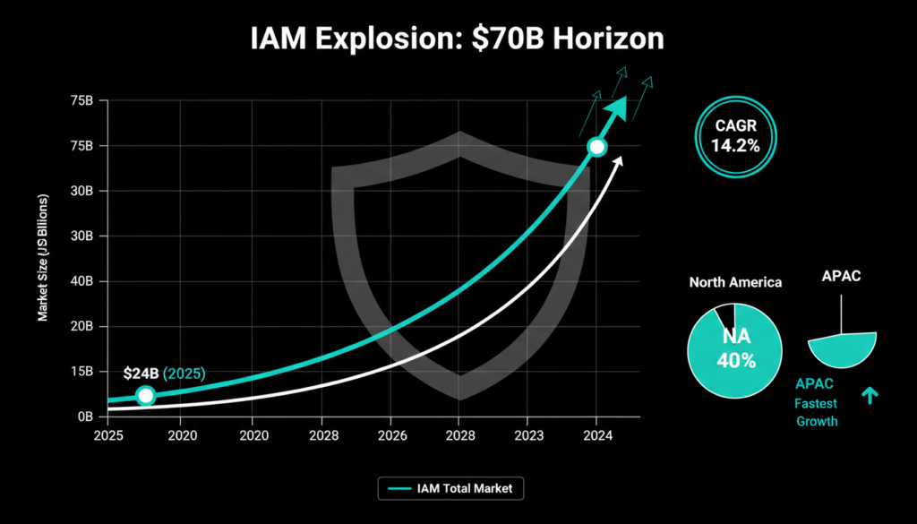 Identity and access management spending topped $24 billion in 2025, up 13% year over year. Projections show $24.3 billion to $24.8 billion in 2026, with a 14-15% CAGR pushing toward $70 billion-plus by 2034.