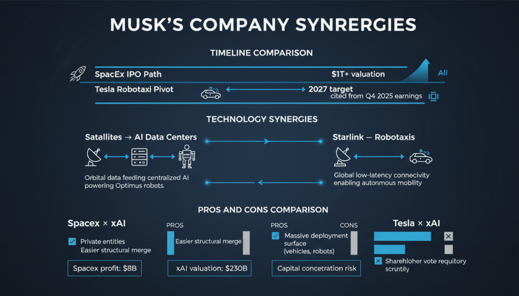 In essence, SpaceX-xAI offers Musk a quick win toward his empire dream, leveraging private flexibility and AI-space synergies. Tesla lags due to public pressures, high valuations, and transition pains, but long-term integration could supercharge robots and autonomy. Investors bet on Musk’s track record watch 2026 for IPOs and deals that redefine tech giants.