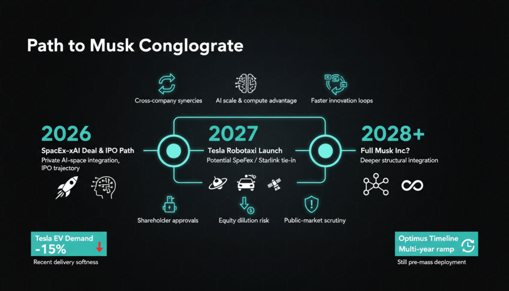 Elon Musk‘s vision of a unified “Musk Inc.” has fans buzzing, but blending his companies isn’t straightforward. SpaceX and xAI could team up smoothly soon, especially with SpaceX eyeing a 2026 IPO after posting $8 billion in profits last year. Tesla, however, faces hurdles in shifting from electric vehicles (EVs) to AI-powered robotaxis and humanoid robots amid slumping sales. Analysts say start small SpaceX with xAI first before dreaming bigger.