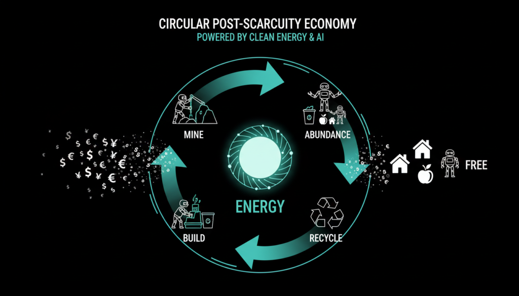 Picture this: Musk, fresh off his $56 billion Tesla payout fight, calls money a mere “labor database.” Automate labor, and it vanishes replaced by energy as currency. In a closed loop future, robots mine, build chips, and recycle endlessly.