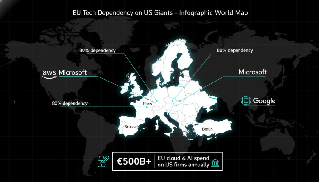 • Historical Roots: Patriot Act and Snowden leaks exposed surveillance risks; now €500B yearly EU spend on US clouds fuels urgency.