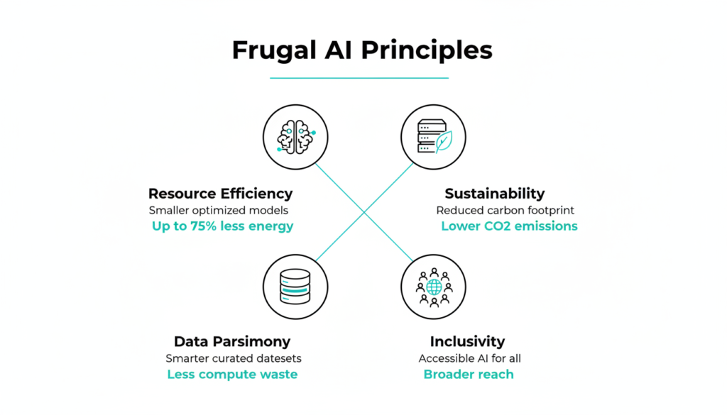 Frugal AI prioritizes resource efficiency and sustainability by designing AI systems that deliver strong results with minimal data, compute power, and energy. It counters the skyrocketing costs of training large models like GPT 4, which consumed over 50 GWh enough to power San Francisco for three days. Core principles include data parsimony, transfer learning, and edge AI to make technology accessible in resource limited settings.