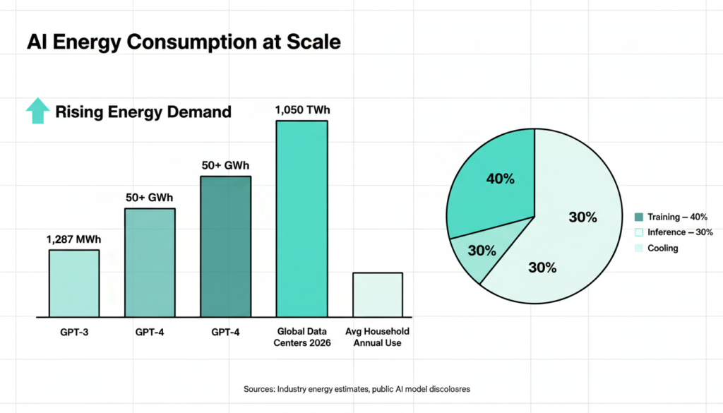 Training one frontier AI model can emit as much CO2 as five cars over their lifetimes, with data centers now using 2-3.7% of global electricity. By 2026, AI driven demand could hit 1,700 TWh in high adoption scenarios, straining grids and boosting emissions. Inference the ongoing use of models further amplifies this, as billions of daily queries require constant power.