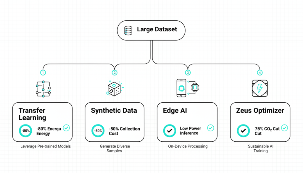 Key methods include transfer learning, where pre trained models are fine tuned on small datasets, slashing training time and energy. Tools like Zeus from the University of Michigan cut AI training carbon by up to 75% by balancing speed and efficiency no new hardware needed.