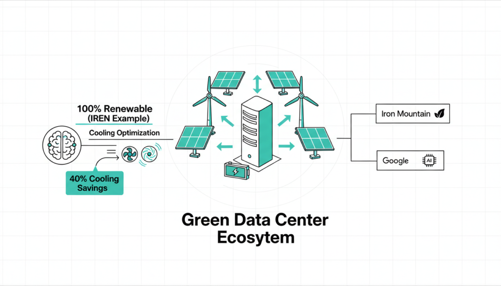 Solar farms and wind deals power many facilities; advances in photovoltaics pack more output into less space. Companies like IREN run 100% renewable data centers for AI workloads, including NVIDIA GPUs. Iron Mountain’s centers use full renewables and aim for climate neutrality by 2030.