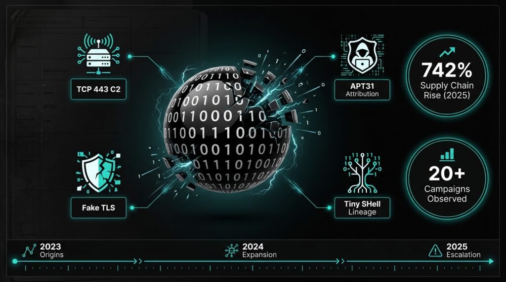 Socket.dev confirmed 555.mp5 as Rekoobe, linked to APT31 (aka Zirconium) with roots in Tiny SHell. It phones home to 154.84.63.184 on TCP 443 without proper TLS fake HTTPS traffic. sss.mp5 handles recon and loading. Per CrowdStrike’s 2026 Adversary Universe, APT31 has evolved Rekoobe for supply chain hits, targeting devs in finance and tech sectors.