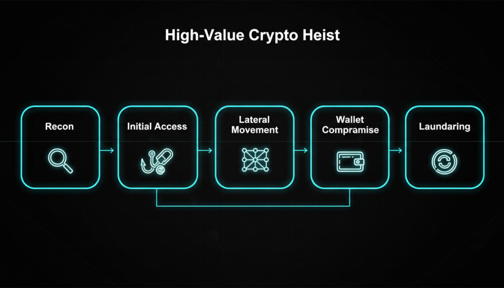 Pressure Chollima, by contrast, goes after large, high value cryptocurrency targets with more complex and tailored operations. This group is associated with advanced, low prevalence implants and carefully customized malware that is not widely distributed, making detection harder. It often targets major exchanges, DeFi platforms, and entities holding large volumes of digital assets. Campaigns may involve extended reconnaissance, exploiting supply-chain relationships, and multi-stage intrusions where initial access is followed by lateral movement, privilege escalation, and careful exfiltration of private keys or hot wallet credentials. Analysts believe that operations like these are crucial for North Korea’s strategy to evade international sanctions, as stolen crypto can be laundered through mixers, nested wallets, and over-the-counter brokers before being converted to usable funds or goods.