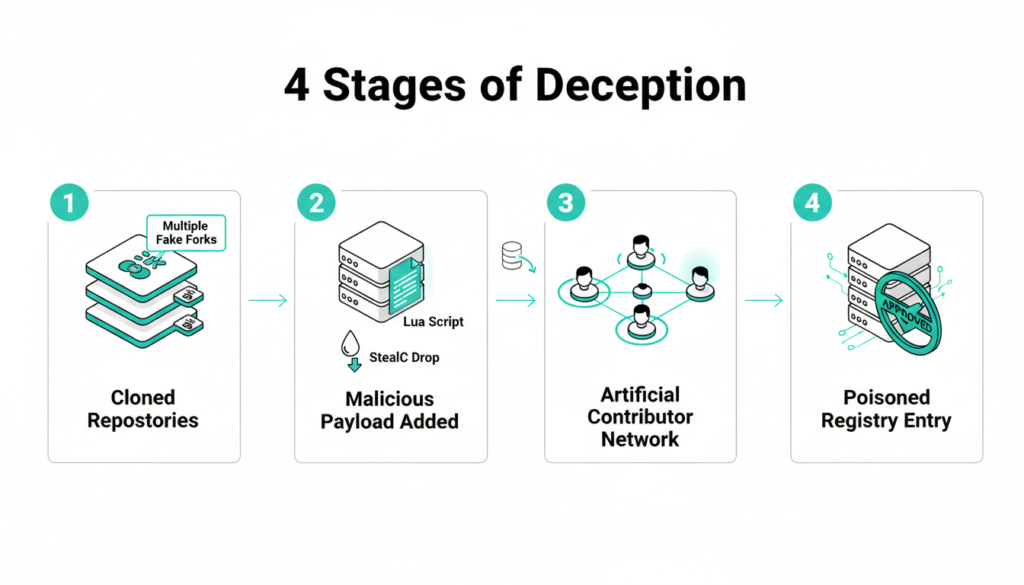 The campaign breaks into four calculated stages, showcasing attackers’ patience. First, they spun up at least five fake GitHub accounts YuzeHao2023, punkpeye, dvlan26, halamji, and yzhao112 to fork the original Oura MCP server repo. This created a web of “legit” activity. Next, under a new account “SiddhiBagul,” they built a fresh repo embedding the malicious payload: an obfuscated Lua script that drops SmartLoader upon ZIP extraction.