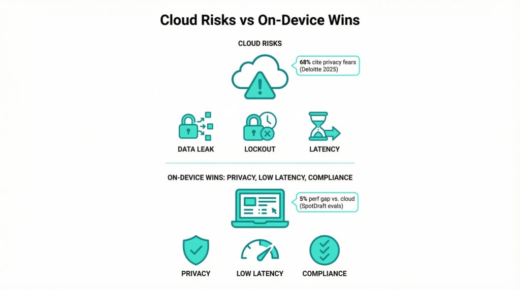 Demand for enterprise AI that skips the cloud is exploding, especially in regulated fields like legal, finance, and pharma. Sending contracts packed with IP, pricing secrets, and deal terms to remote servers risks breaches, and Deloitte’s 2025 GenAI risk report flags data privacy as the top barrier, with 68% of pros citing it as a deployment roadblock.