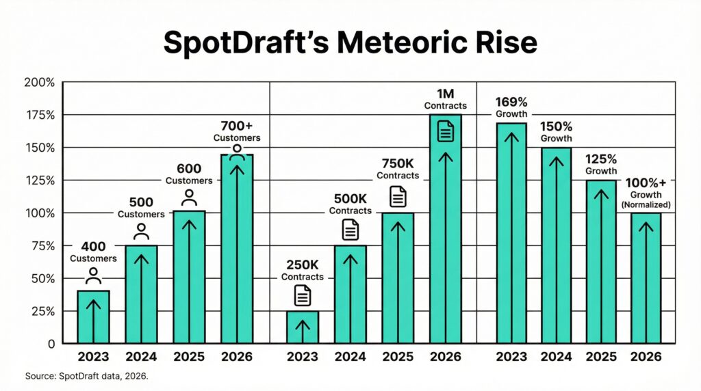 Since 2017, SpotDraft has grown to 700+ customers (up from 400 last year), including Apollo.io, Panasonic, Zeplin, and Whatfix. Their platform now crunches 1M+ contracts yearly a 173% YoY jump with 50K monthly users. Revenue? Expect 100% growth in 2026, after 169% in 2024 and similar in 2025.
