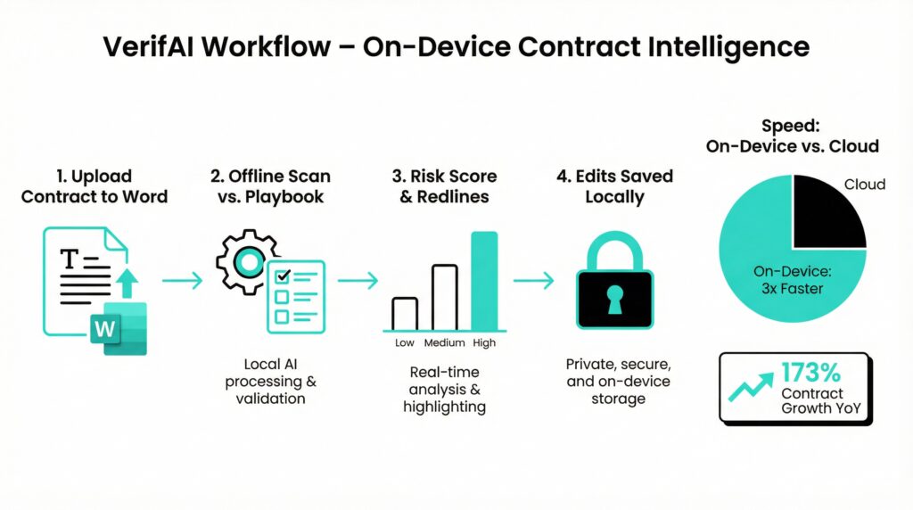 Plug VerifAI into Microsoft Word, and it auto scans against your guidelines redlining risks, suggesting fixes, all offline. Bhagat notes on device models now trail cloud frontiers by just 5% in quality, with speeds hitting one third of cloud times on new chips. McKinsey’s 2025 edge AI report echoes this, predicting on device inference will dominate latency sensitive apps by 2026, cutting costs 40% via no data egress fees.