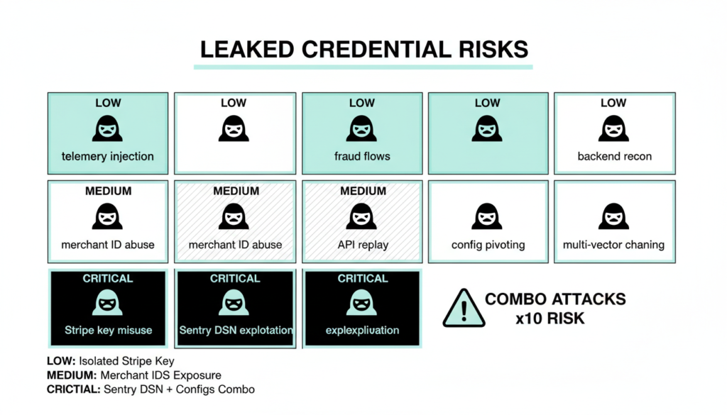 Why does this combo matter? Stripe keys alone are low risk, but mix them with merchant IDs, venue flags, and Sentry access, and attackers get a blueprint for fraudulent transactions or backend reconnaissance. A leaked Sentry DSN lets hackers inject fake telemetry, snoop on errors, and map your infrastructure. Per-venue feature flags reveal exactly which ordering modules are live at each spot, widening the attack surface.