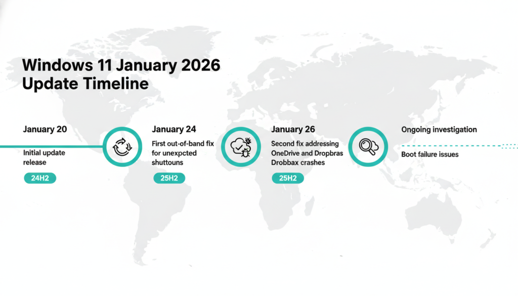 Key fixes timeline: Jan 17 (RDP/hibernation), Jan 24 (shutdowns + cloud sync), with Feb Patch Tuesday expected to deliver full postmortem. Users should defer updates, check OEM BIOS, run troubleshooters, and monitor release health dashboard to avoid disruptions.
