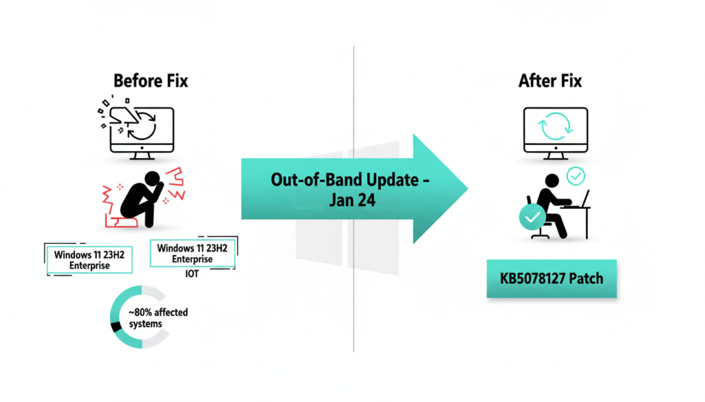 The trouble started last weekend when users reported machines failing to shut down properly after installing the January 2026 update, specifically KB5078482 for Windows 11 version 23H2 Enterprise and IoT editions, alongside earlier issues like hibernation failures and remote desktop connection drops fixed in a January 17 OOB patch. Affected systems would hang indefinitely or restart unexpectedly, disrupting workflows for businesses relying on these setups think kiosks, embedded devices, and corporate fleets. Microsoft quickly acknowledged the issue and pushed an out-of-band patch KB5078127 and KB5078132 on January 24, targeting OS builds like 26200.7628, 26100.7628, and 22631.6495 for 23H2.