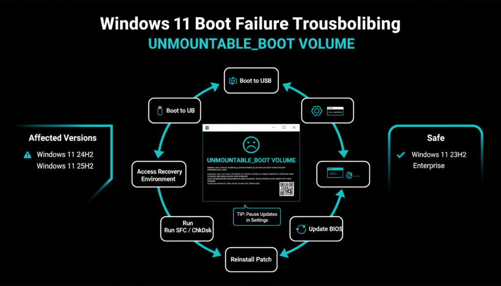 Ongoing investigations target boot failures (UNMOUNTABLE_BOOT_VOLUME bluescreens) affecting newer versions, paused via enterprise tools while Microsoft probes storage/BIOS conflicts similar to 2025 SSD issues. IT admins face weekend deployments and recovery headaches across 1.4B+ devices.